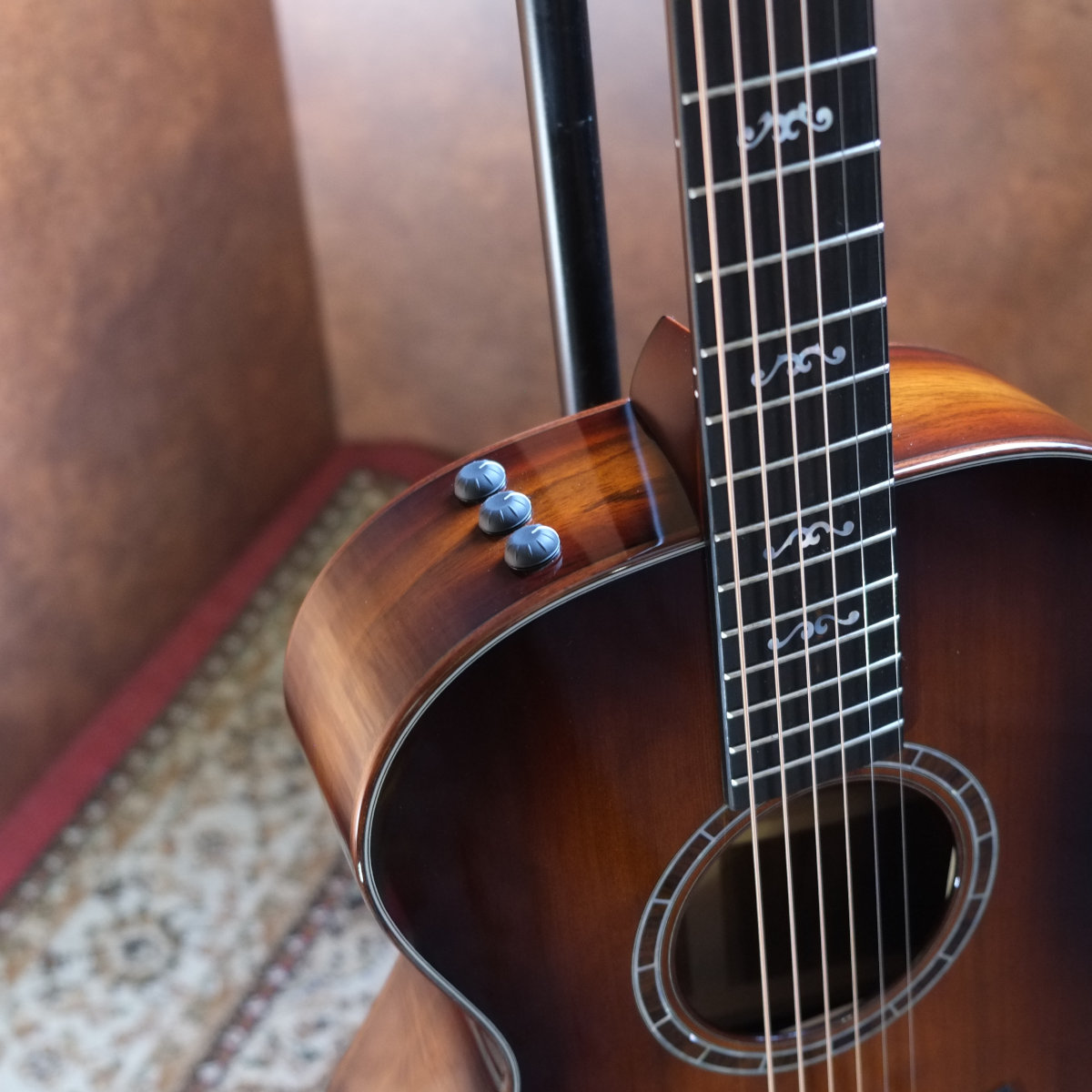 At the heart of the Harvester lies a Sinker Redwood top, a tonewood revered for its warmth, responsiveness, and cedar-like articulation with added power. This wood, sourced from century-old logs reclaimed from riverbeds, offers both history and depth in its tone. Bocote back and sides add a striking visual element with their swirling grain patterns while delivering rich bass, articulate mids, and shimmering highs. The pairing of these two tonewoods results in a guitar that is both lively and nuanced, perfect for intricate fingerstyle playing and expressive lead work.