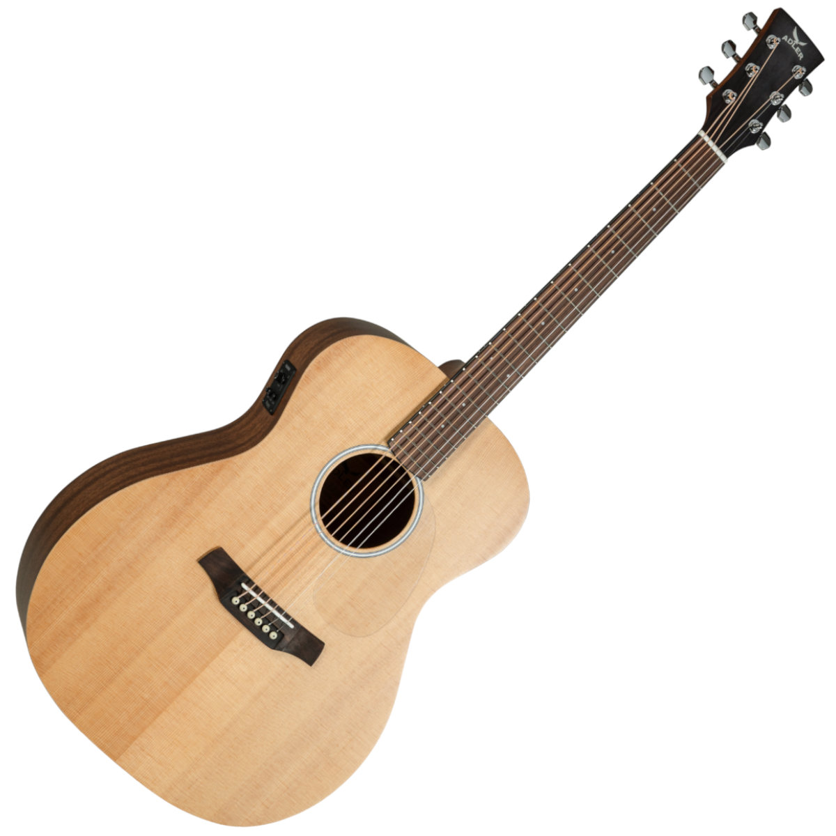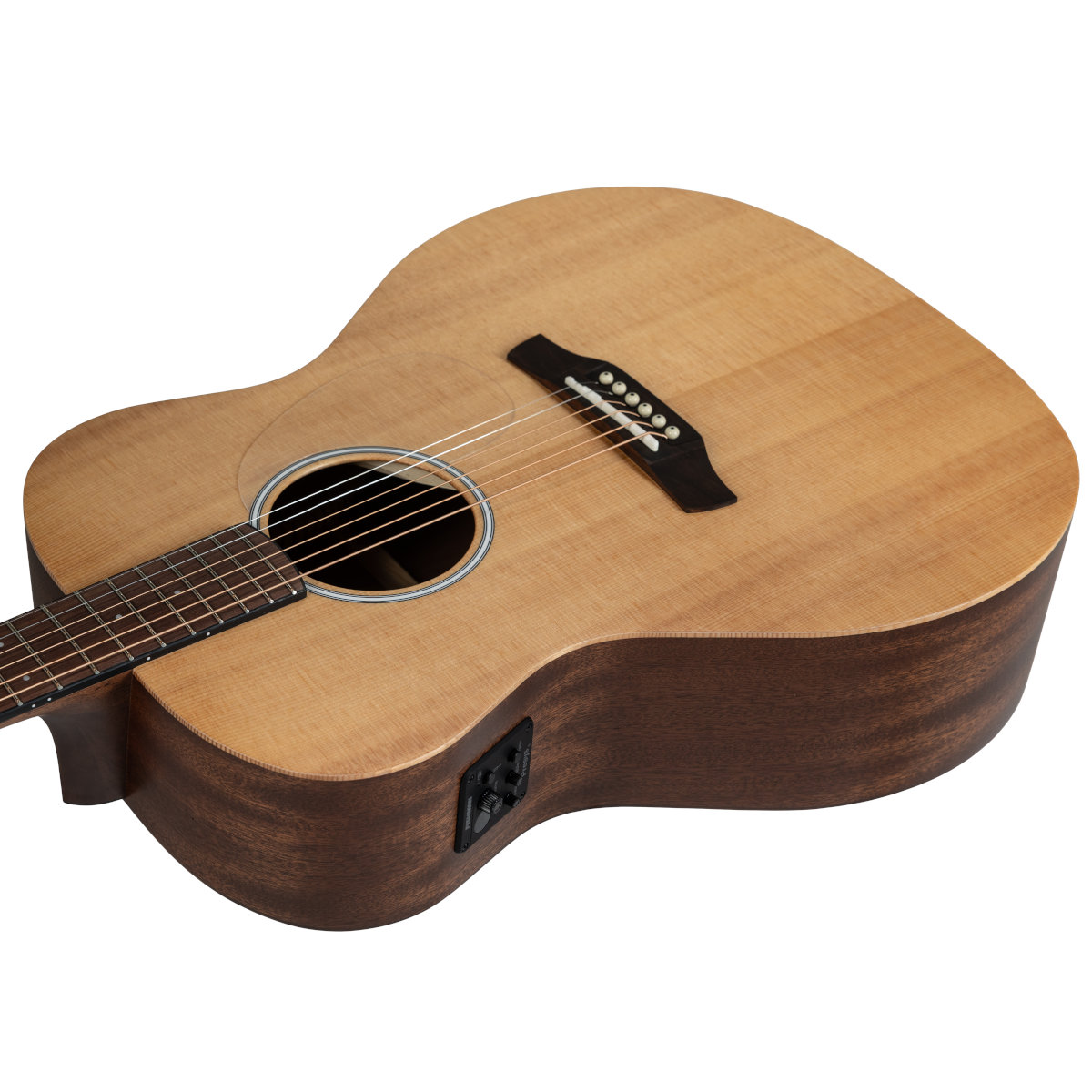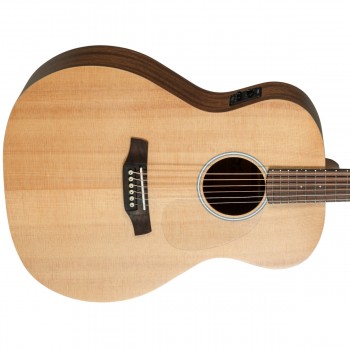 A mahogany neck with a comfortable 43 mm nut width and smooth Pau Ferro fingerboard ensures easy playability right across the 643 mm scale. Premium touches like a bone nut and saddle, chrome diecast tuners, acrylic dot inlays and black fingerboard binding give this guitar a refined but understated visual appeal. A clear pickguard protects the top while keeping the spruce grain fully visible.