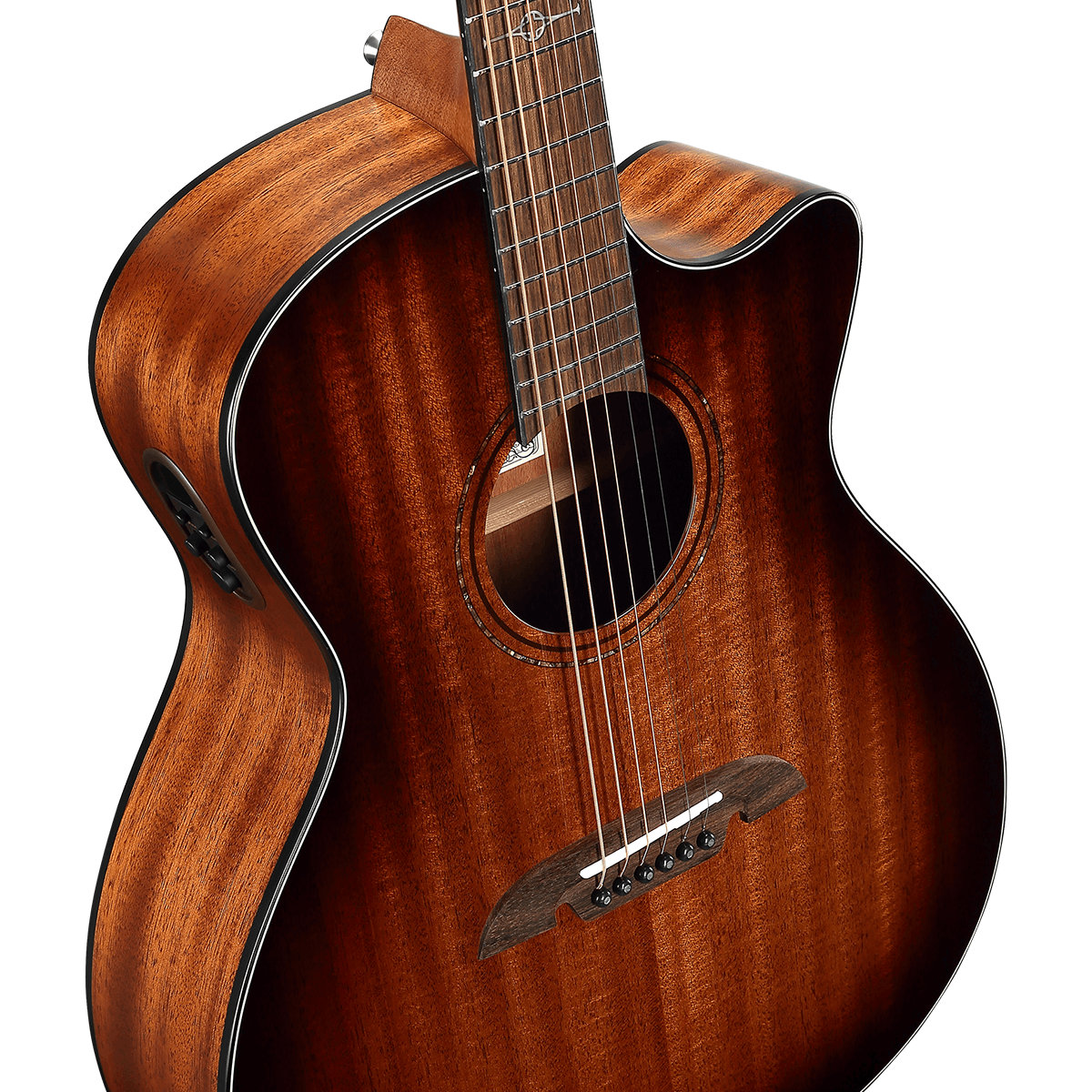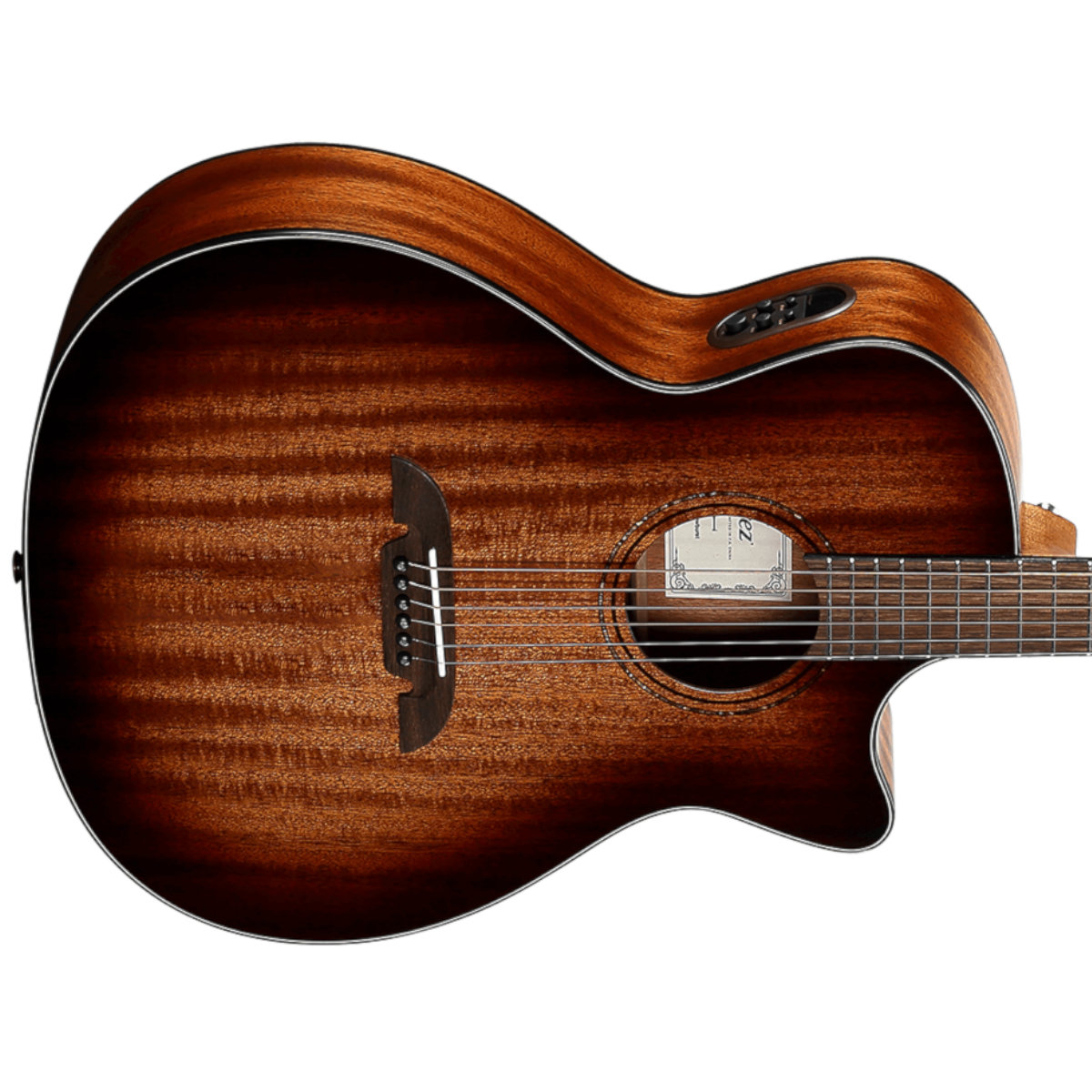 The Alvarez AG66ce Artist Series Grand Auditorium in Shadowburst brings the rich, woody character of all-mahogany construction into one of the most versatile acoustic body shapes available. If you love warmth, strong midrange presence and a naturally compressed response, this guitar delivers in style.