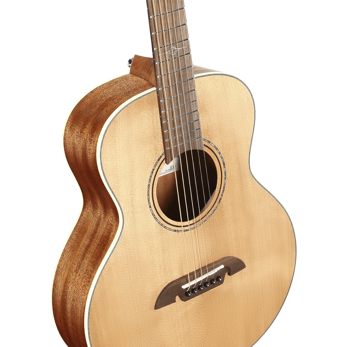 At the heart of the ALJ2 is a solid A+ Sitka spruce top, independently selected and graded to ensure responsiveness and tonal consistency. Sitka brings clarity and dynamic range, giving the guitar a lively voice that reacts beautifully to both light fingerstyle and confident strumming. Paired with African mahogany back and sides, the tone remains warm and balanced without becoming boxy or congested.