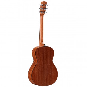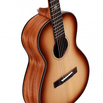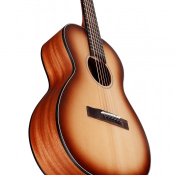 The African mahogany neck pairs comfortably with an Indian laurel fingerboard, adorned with tasteful MOP and acrylic inlays. A bone nut and saddle enhance sustain and tonal clarity, while the Indian laurel bridge ensures solid tonal transfer. Chrome closed-gear tuners provide stable, dependable tuning, and the 14th-fret neck join offers comfortable access across all 20 frets.