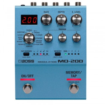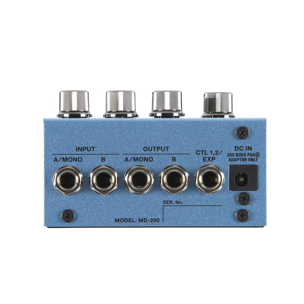 Based on the legendary MD-500, the MD-200 packs the same advanced algorithms and tech into an even smaller unit. Twelve modes give you every mod effect you need. And each mode has three custom adjustable parameters. While incredibly tactile controls let you make adjustments easily. You can have your sound exactly how you want it. Tap in rates with footswitch-controlled tempo. And patch in additional pedals and other MIDI-equipped devices thanks to a versatile insert function. Boss don't just give you a plethora of modulation options. They also make sure that they all sound great. With 32-bit AD/DA, 32-bit internal processing, and a 96 kHz sampling rate. The MD-200 is built with the same unparalleled quality you've come to expect from Boss.