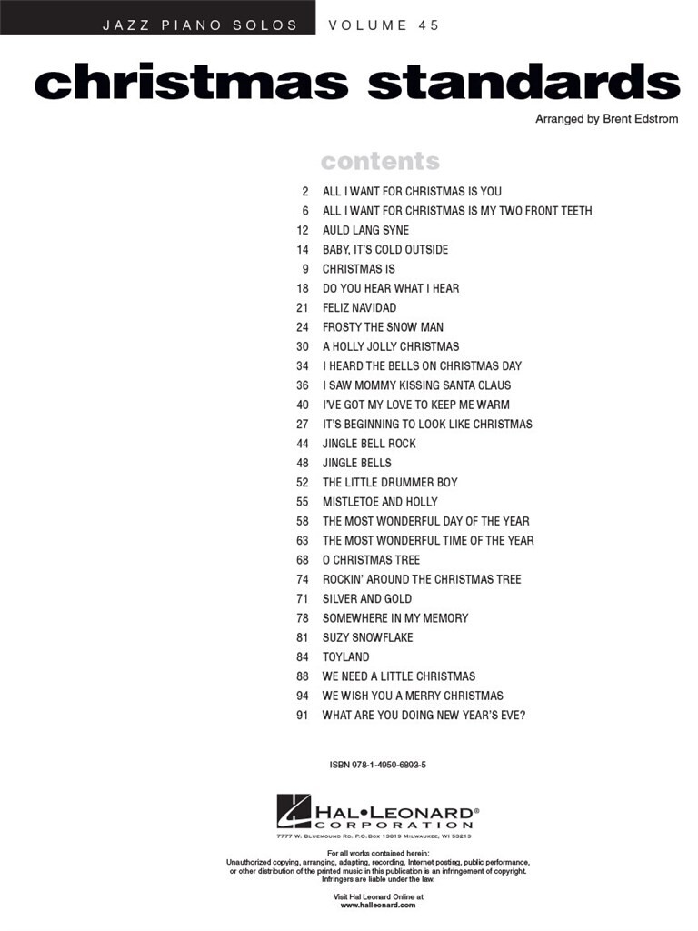 28 hallmarks of the holiday season arranged for jazz piano and including chord names. Songs include: Auld Lang Syne · Feliz Navidad · Frosty the Snow Man · I Saw Mommy Kissing Santa Claus · It's Beginning to Look like Christmas · Jingle Bells · The Most Wonderful Time of the Year · O Christmas Tree · Rockin' Around the Christmas Tree · We Wish You a Merry Christmas · and more.