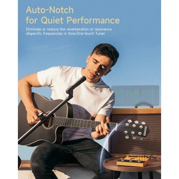 One of the killer features is Auto-Notch / Anti‑howling — that auto frequency sweep tool can detect trouble frequencies (feedback‑prone ranges) and suppress them, letting you play confidently without tone‑killing ring during gigs. Add in a built-in chromatic tuner with bypass or mute options, and your performance essentials are covered.