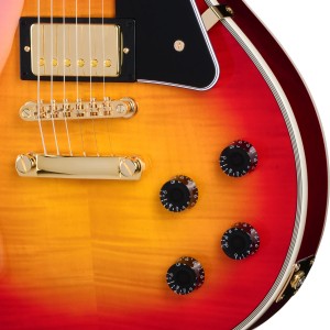 Built with a solid mahogany body and a carved maple top, this Les Paul Custom offers the thick sustain, punch and harmonic richness that define the Les Paul sound. The maple adds clarity and bite, while the mahogany provides warmth and depth — a combination that excels at everything from smooth cleans and bluesy leads to soaring rock tones. The Heritage Cherry Sunburst finish adds a timeless visual flair, highlighting the carved top while standing out beautifully under stage lights.