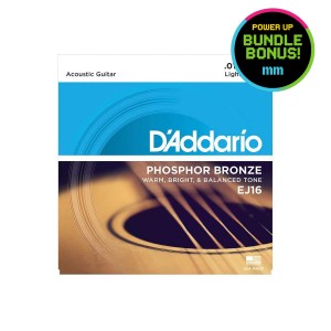 You’ve also got a Musicmaker sustainable strap, so you’re ready to play standing up straight away — ideal for getting comfortable or moving into live playing. Add in a set of D’Addario EJ16 phosphor bronze strings, and you’re sorted for tone too. These are a go-to set for a reason — warm, balanced, and reliable across pretty much any acoustic.