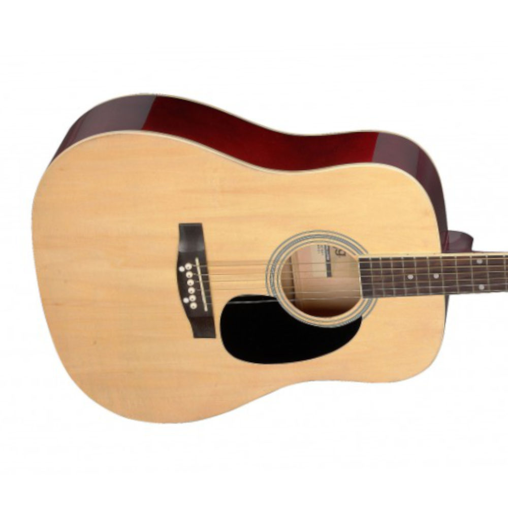 With a spruce top matched by laminated mahogany back and sides, the guitar gives you crisp projection and balanced warmth. The neck is shaped for comfort, the shorter body size reduces fatigue, and the overall build means you’re still getting great tone for the size. Finished in natural gloss with chrome hardware and a traditional dreadnought silhouette, it’s a guitar that looks good, sounds good — and plays well from the first chord to the full song.
