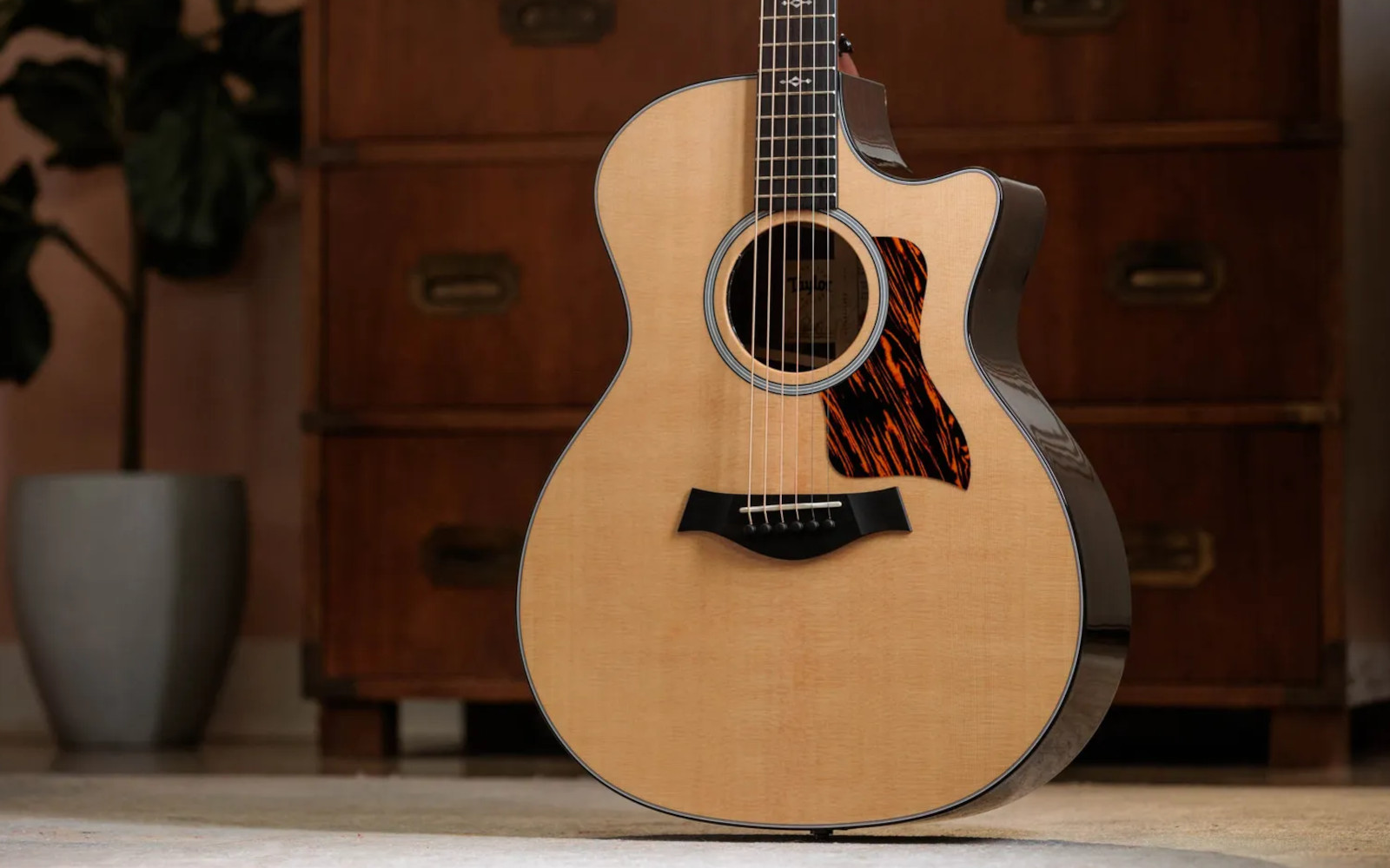 Visually, the 414ce keeps things classy but distinctive. A full gloss-finish body, black binding, and firestripe pickguard give it a refined, modern look, while details like Weathervane inlays, Taylor nickel tuners, and a single-ring Italian acrylic rosette with black and white purfling add subtle character without overdoing it.