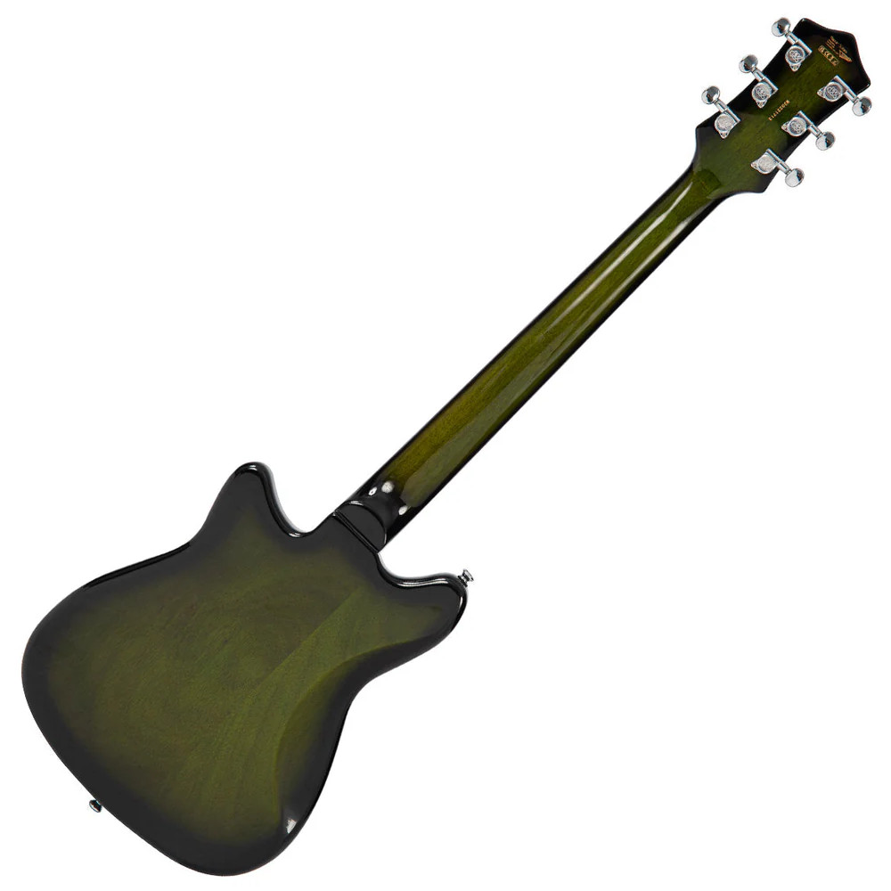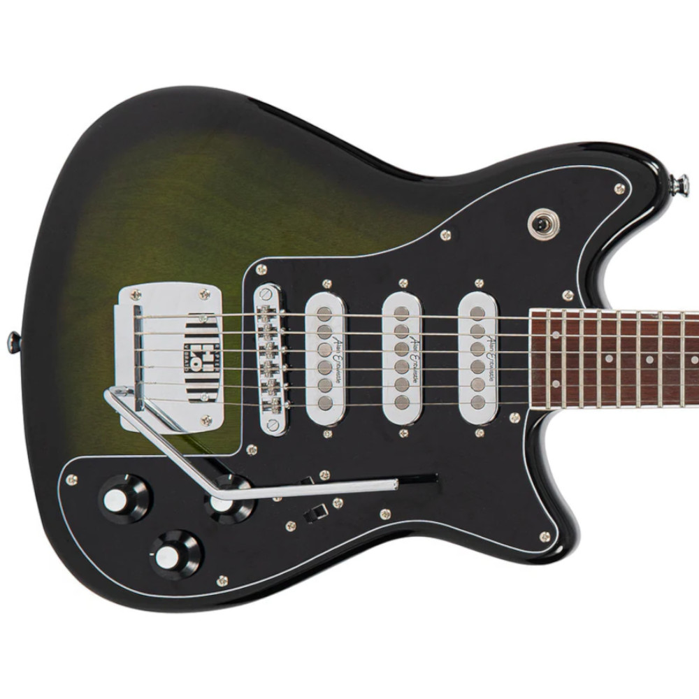 The Rapier Mercury is a bold revival of a British classic, meticulously redesigned by Alan Entwistle to bring vintage cool into the modern age. Finished in a rich greenburst stain, this guitar is all about warmth—both in tone and appearance. Its lightweight okoume body makes it comfortable to hold for long sessions while keeping resonance open and alive, paired with a hard rock maple neck that adds stability and snap.