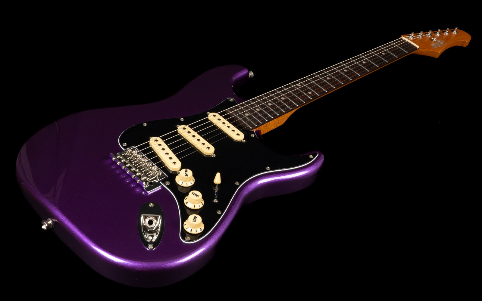 The Jet JS-300 PLM R is a fresh take on a timeless solid-body design, finished in a rich plum shade that exudes understated sophistication. Its contoured poplar body delivers a balanced, resonant tone while keeping weight comfortable for long playing sessions, making it equally at home in the rehearsal room, studio, or under stage lights. The roasted maple neck adds a touch of refinement and stability, its smooth satin finish and Modern C profile offering a natural, unforced playing feel.