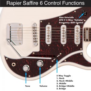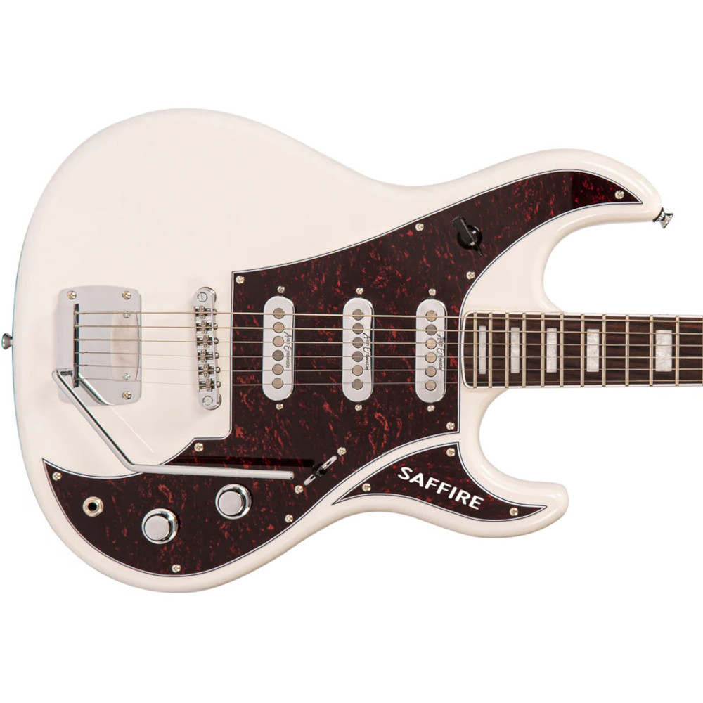 Hardware appointments include a Rapier Hi Lo vibrato system for expressive pitch bends, a compensated roller bridge for smooth tuning stability, and a GraphTech Nubone nut for consistent resonance. Chrome hardware and the distinctive “Saffire” pickguard logo complete the instrument’s retro-modern personality.