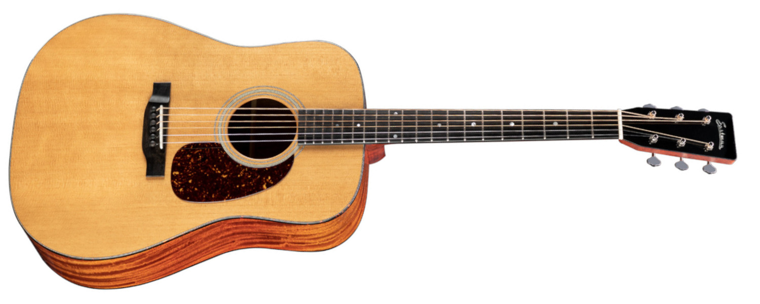The Eastman E1D Truetone Solid Gloss Acoustic Guitar is a blend of elegance and performance, featuring a solid Sitka spruce top and solid sapele back and sides for a rich, resonant tone that captivates any audience. The traditional Even "C" mahogany neck with an ebony fingerboard and 20 Jescar-FW43080 frets ensures exceptional playability and comfort, while the Fishman Presys VT pickup system offers versatile amplification without compromising its natural sound. Attention to detail is evident in the classic rosette, tortoise binding, pearl inlay, and open-gear PingWell V93N tuners, complemented by a bone nut and ebony bridge/saddle for precise intonation and sustain. Complete with a deluxe padded gig bag, the E1D is perfect for both seasoned pros and aspiring musicians, ready to accompany you on any musical journey with craftsmanship, quality, and versatility.