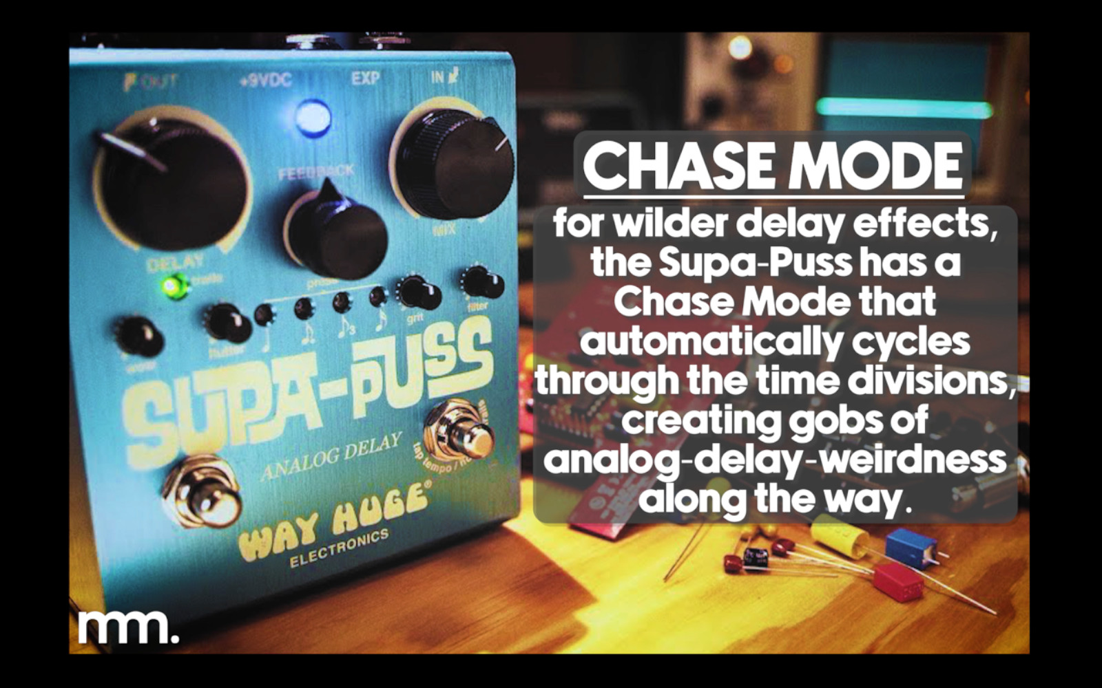 Chase Mode in the Way Huge Supa Puss Analog Delay is a unique and creative feature that allows the pedal to cycle automatically through its different delay subdivisions. Instead of staying locked into one subdivision (like quarter notes or dotted eighths), Chase Mode continuously transitions between them in a rhythmic sequence. This creates a dynamic, shifting delay pattern that adds movement and complexity to your sound.