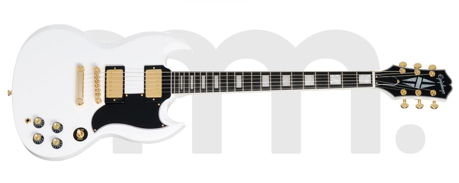 Then there’s the SG Custom — the show-stopper. Finished in Alpine White, trimmed in gold hardware, and housed in its Premium Gig Bag, it’s equal parts class and chaos.
