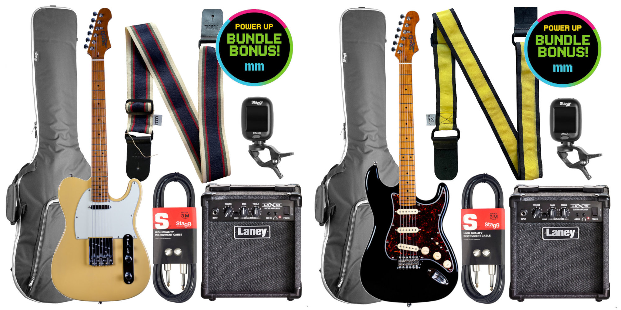 - Top pick: The Musicmaker Jet Pack Guitar Bundle — includes a Jet JS-300 Electric Guitar, Laney LX10 amp, cable, tuner, and sustainable strap. Everything in one tidy, affordable bundle.