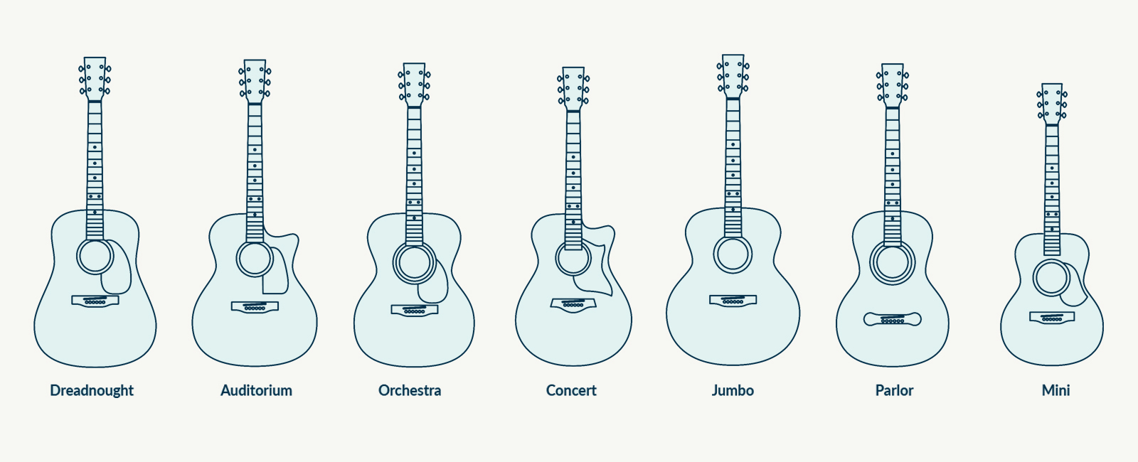 Dreadnought - The most popular acoustic guitar shape. Loud, bold and bassy. Fantastic for strumming and singing.