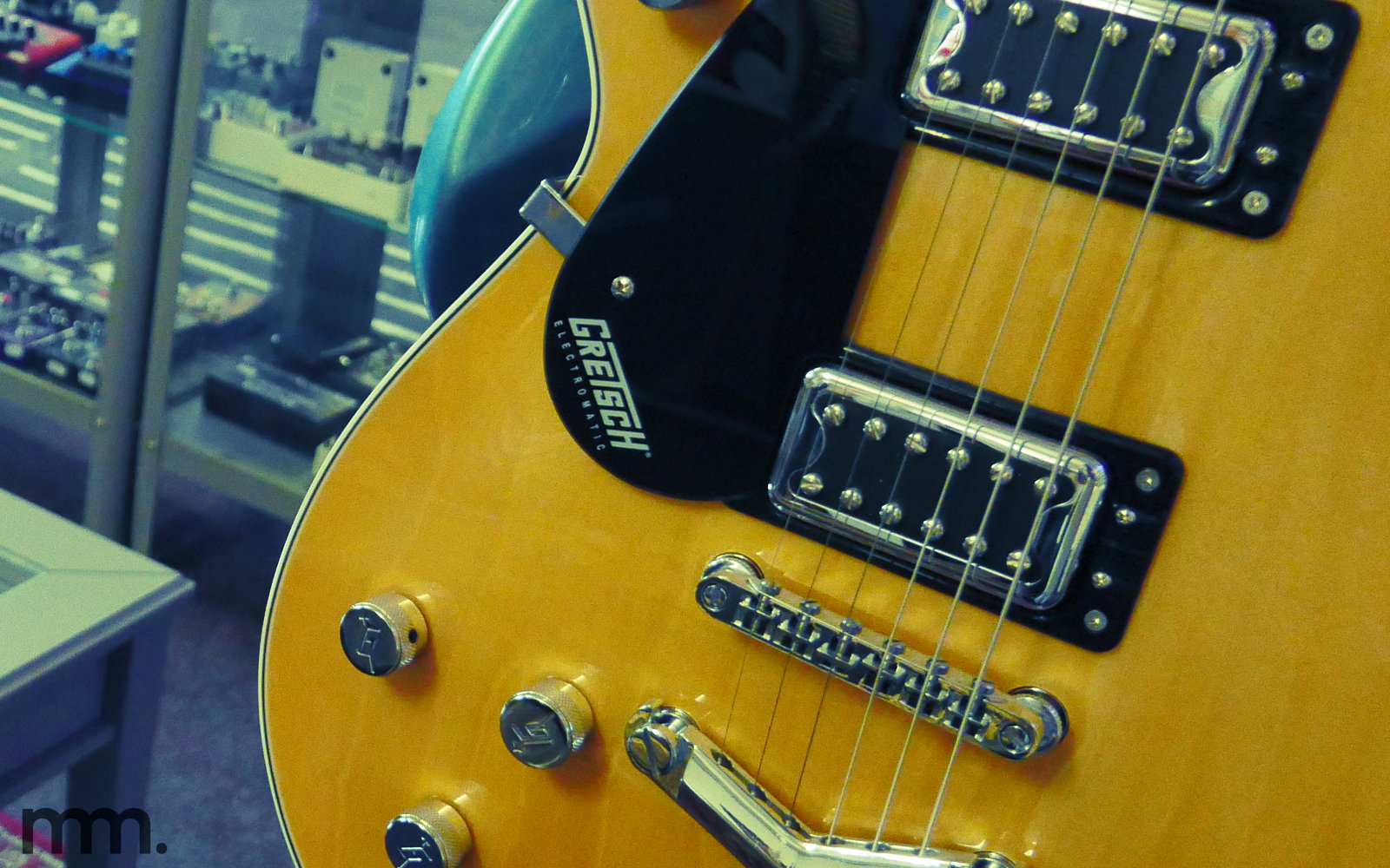 Bridge - The piece of hardware where the strings anchor on the body. On acoustics it transfers vibration into the top wood. On electrics it sets intonation and tuning stability.