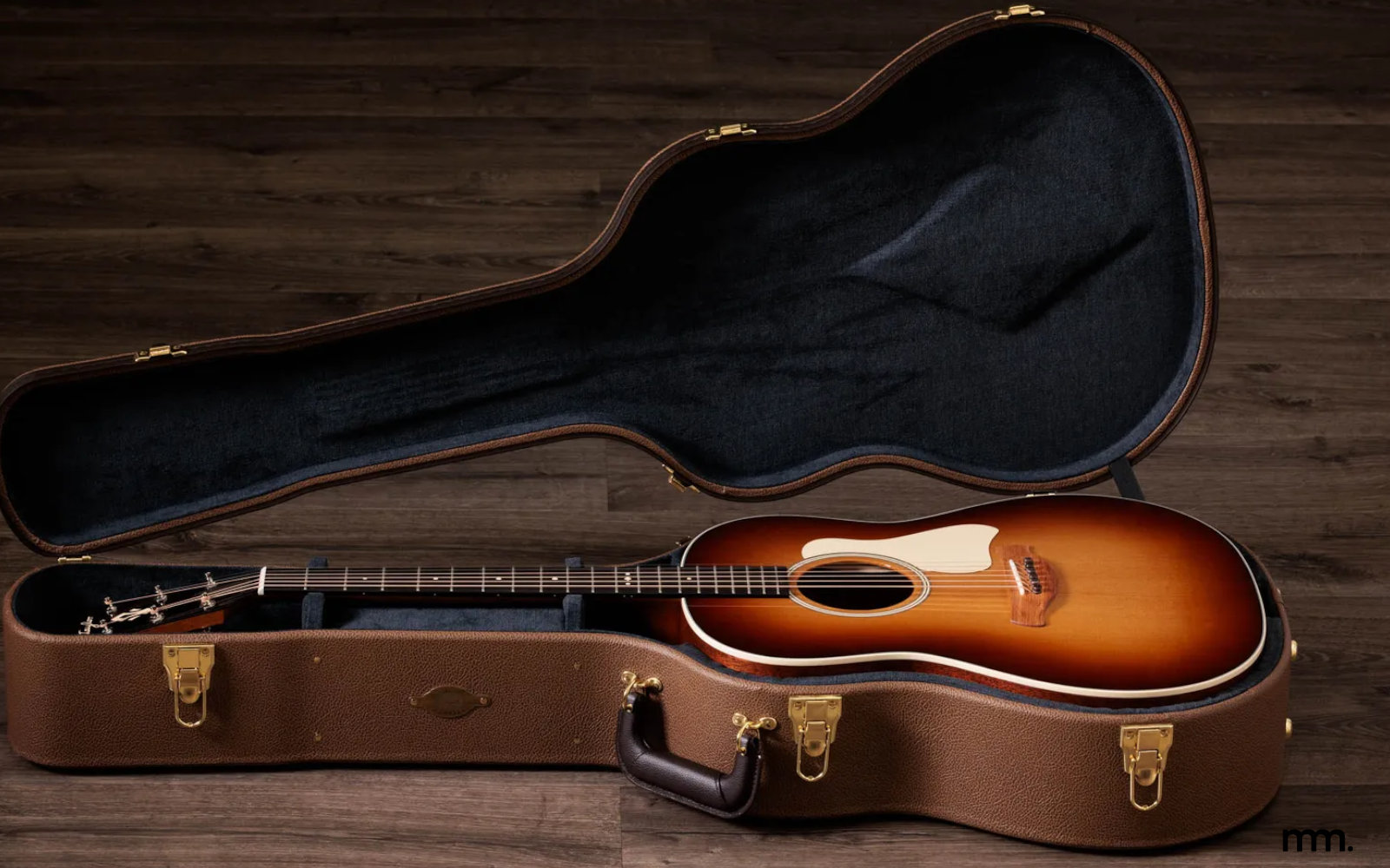 On one side: Taylor Gold Label 517e SB Torrified Spruce / Mahogany – Sunburst. Cloaked in fire and dusk.