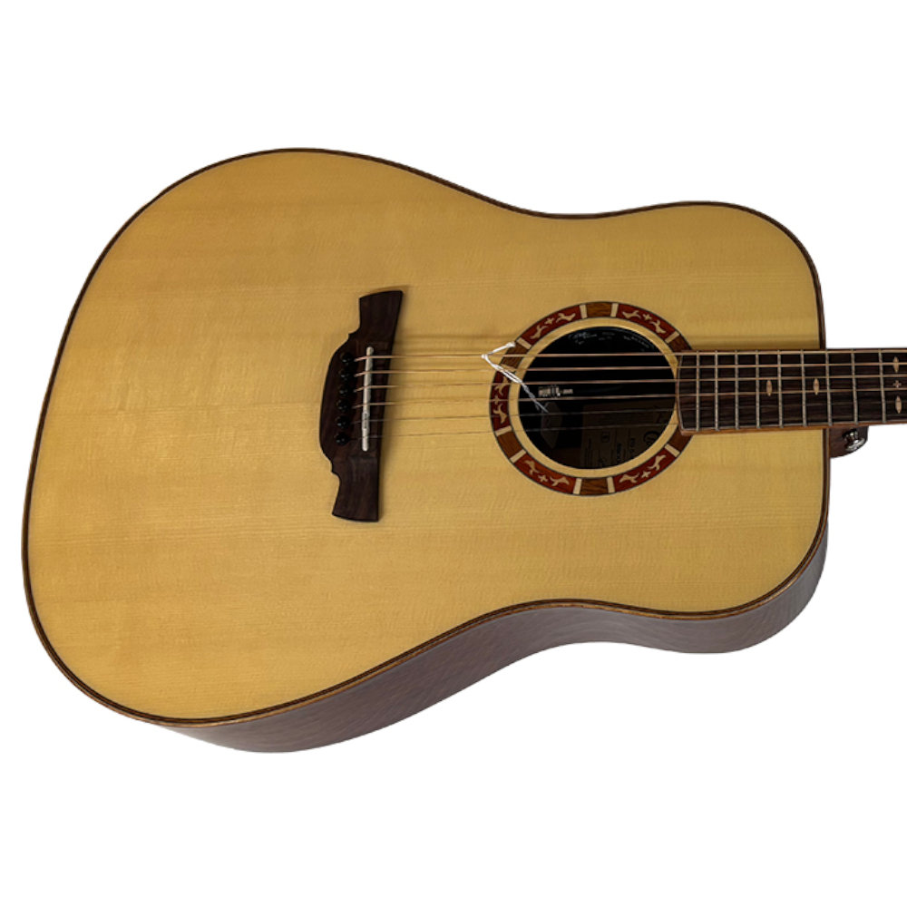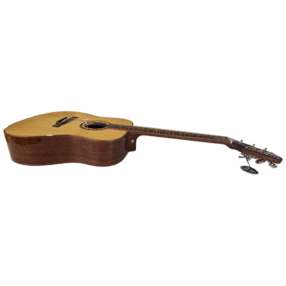At the heart of the guitar is a solid Engelmann Spruce top, a tonewood prized for its responsiveness and balanced tonal character. Engelmann spruce produces clear articulation with a slightly softer touch compared to traditional Sitka, making it ideal for both expressive fingerstyle and full-bodied strumming. The top is paired with layered African Mahogany back and sides, adding warmth, depth and a focused midrange that helps the guitar sit beautifully in both live and recording environments.