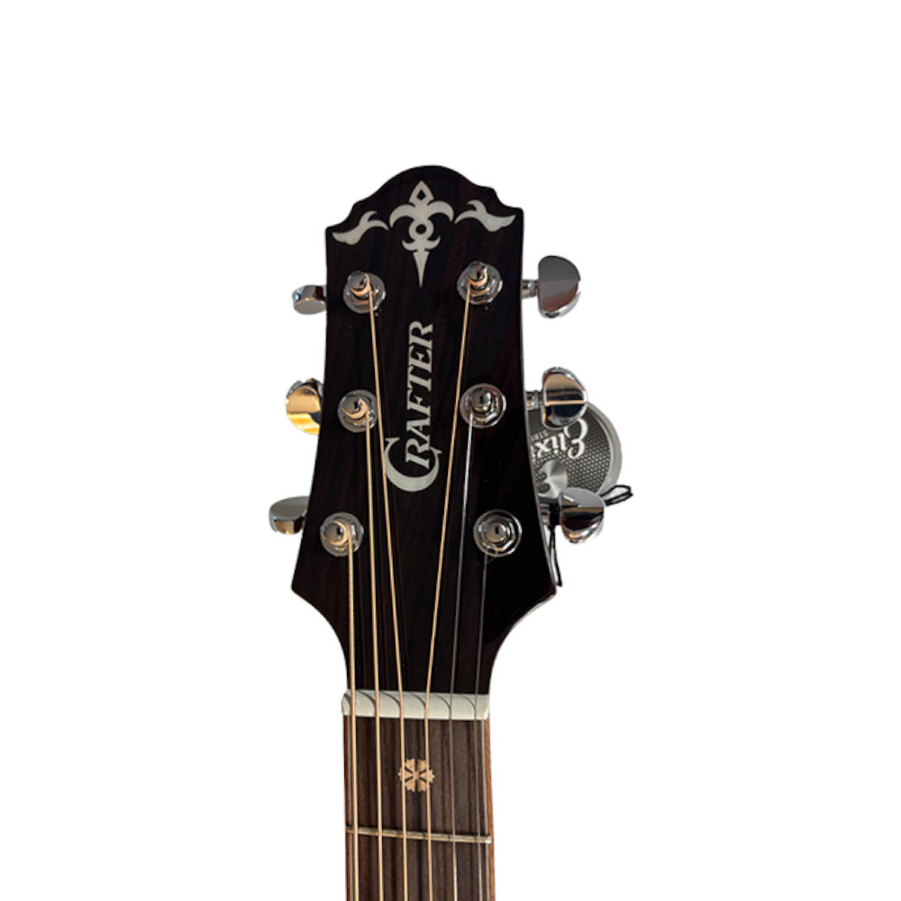 Premium hardware rounds out the instrument, including Grover chrome tuners for smooth, reliable tuning stability, a Crafter signature 7-bar saddle, and Indian black ebony bridge pins. The guitar comes strung with Elixir acoustic strings, known for their long-lasting tone and smooth feel.