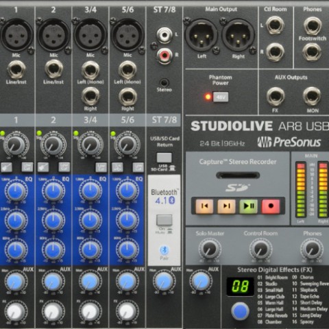 StudioLive AR8 USB 8-channel hybrid mixers make it simple to mix and record live shows, studio productions, band rehearsals, podcasts, and much more. This is a musician’s mixer: lightweight, versatile, feature-rich, and packed with analogue connections and digital tools, yet easy to learn and use. Mix with PreSonus’ famous Class A preamps and three-band EQ. Create multitrack recordings and fly in backing tracks with a 24-bit, 96 kHz, USB 2.0 digital audio interface. Record and playback in stereo with the integrated SD digital recorder. Stream program music wirelessly, using onboard Bluetooth. Compact and road-ready, StudioLive AR mixers provide a superior all-in-one solution for mixing and recording your performances.