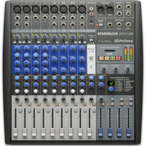 Compact and built for the road, the StudioLive AR12 USB is an easy-to-use, all-in-one solution for audio mixing and recording. With a wide variety of connections, two ways to record, and a simple, elegant mixing surface, it will quickly become the heart of your live and studio sound systems. Check it out now at your favorite PreSonus dealer!