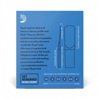 Get excited, the Royal by D'Addario Sax Reeds, a premium choice for saxophonists seeking exceptional tone and playability. Crafted with precision and expertise, these reeds are designed to deliver a rich, warm, and vibrant sound. Each reed is meticulously crafted from premium cane, ensuring consistency and durability. With their versatile nature, these reeds are suitable for various musical genres, from jazz to classical and beyond. The balanced response and smooth articulation make them ideal for both beginner and professional players alike. Available in various strengths, Royal by D'Addario Sax Reeds offer musicians the flexibility to achieve their desired tone and performance. Whether you're practicing, recording, or performing on stage, these reeds provide a reliable and satisfying playing experience that will elevate your saxophone playing to new heights.