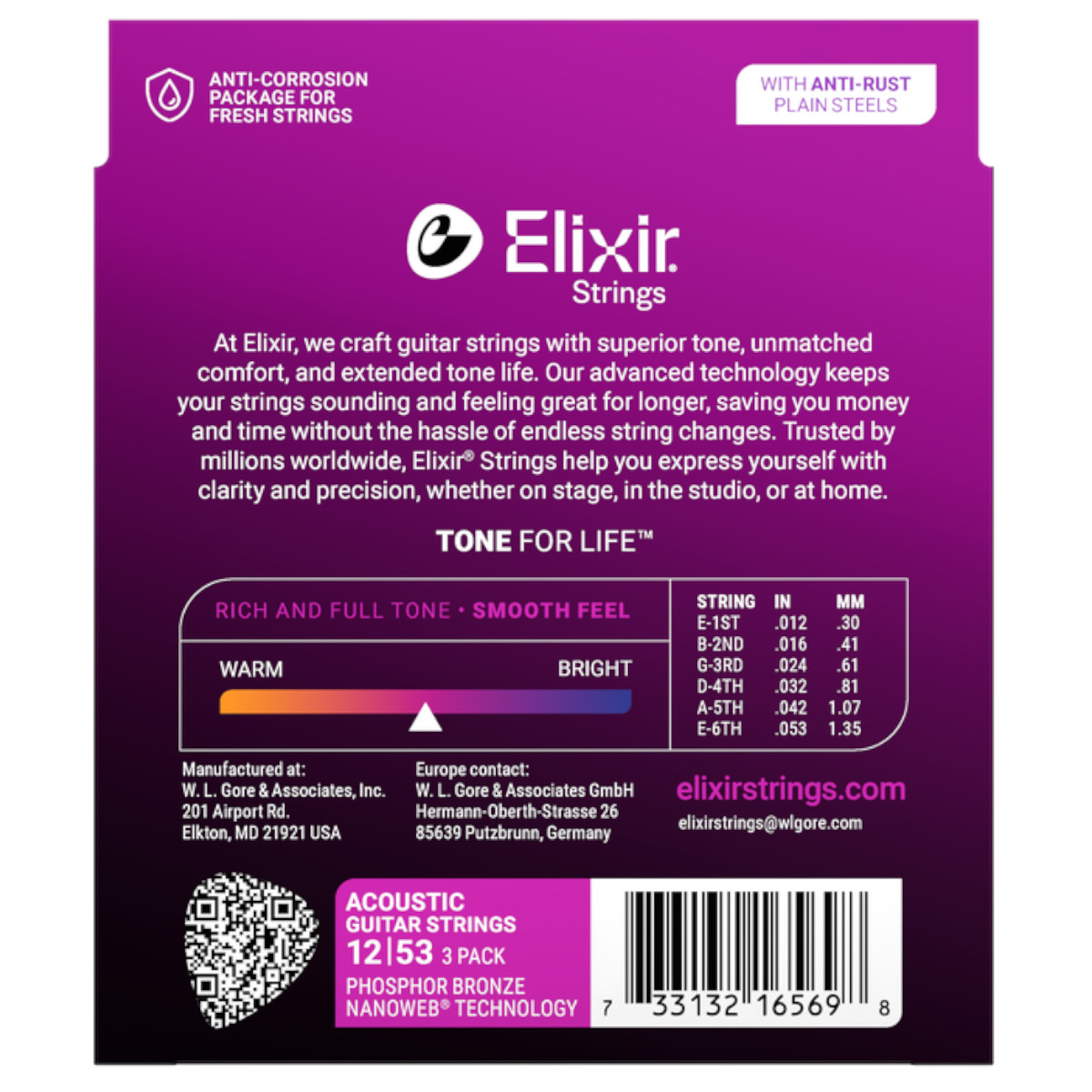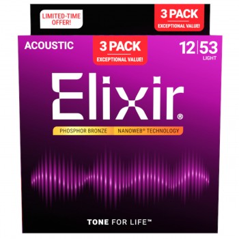 Elixir 16569 Acoustic Nanoweb 92/8 Phosphor Bronze Light ( 12-53 ) - 3 Pack