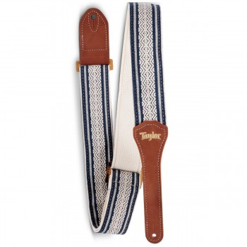 The Taylor Academy Jacquard Leather Guitar Strap delivers comfort and support with an earthy, organic look woven from premium cotton. This unique strap features a jacquard pattern with genuine suede end tabs and an embossed gold Taylor logo. At 2" wide, it provides comfortable support on the shoulder with enough freedom to let you move while you play. The Taylor Academy strap comes in white and brown or white and black. Made in the USA. Taylor Model #4003-20 (White/Brown), #4004-20 (White/Black), #4006-20 (White/Blue)