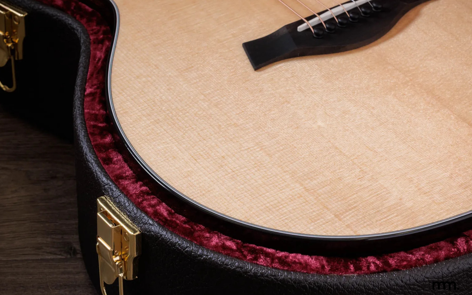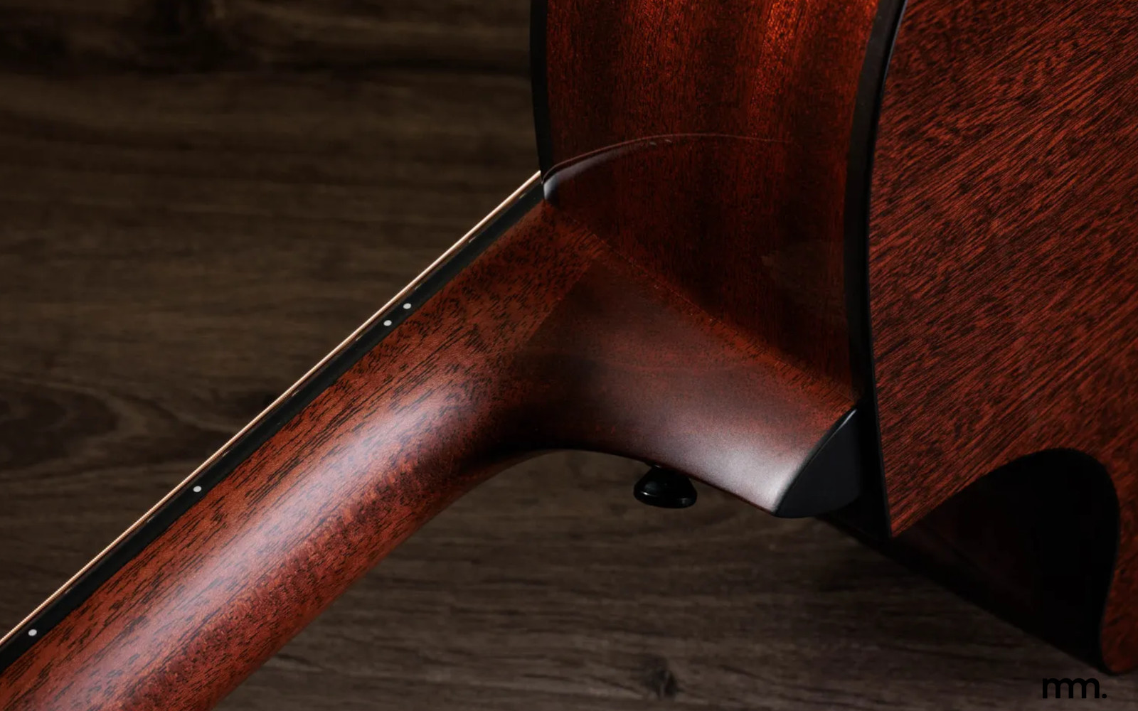 A major upgrade here is the long-tenon Action Control Neck™, which not only boosts resonance — particularly in the low end — but also allows for quick, precise string height adjustments. It’s a dream for players who want their setup exactly right, without hassle. In the hands, it’s everything you’d expect from Taylor — the slim neck profile makes playing effortless, whether you’re practising for hours or performing live.