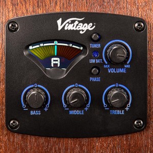 - Electro‑acoustic layout: built‑in preamp with volume, bass, middle, treble, phase switch, and tuner with low‑battery display